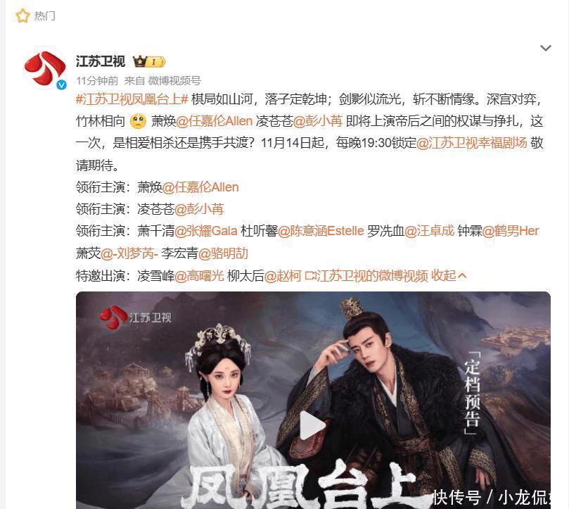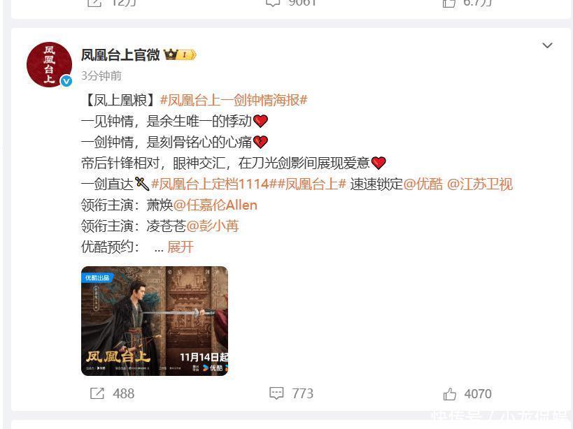 近期,不管是优酷平台还是《凤凰台上》官微,关于《凤凰台上》这部剧的消息可以说是“异动频频”,如此频繁的互动,小编就感觉到这部剧是不是要与观众见面了。果不其然,今天终于等来了这部剧的好消息,11月14日,这部剧终于定档了,这也让很多忠实的粉丝一颗按捺不住的心终于尘埃落定。
